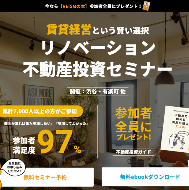 REISMのセミナーは、満足度97%とほとんどの参加者が満足をしているセミナーです。不動産投資業界では珍しく都心のリノベーション物件を対象としています。投資額も新築に比べると低い傾向にあるため高利回りが期待できます。頭金も0円から可能。